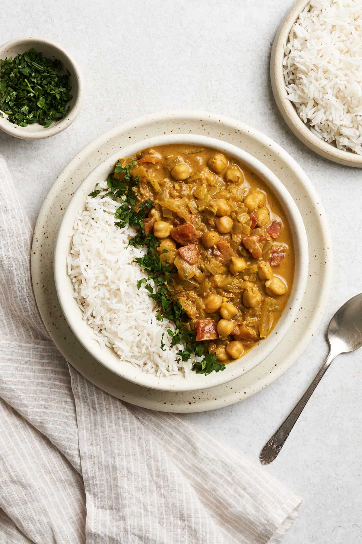 Simmer gently: Avoid vigorously boiling this vegan chickpea curry to prevent the coconut milk from curdling or splitting. You want to keep coconut milk at lower temperatures. Plus, simmering over low heat melds the flavors without burning anything.
