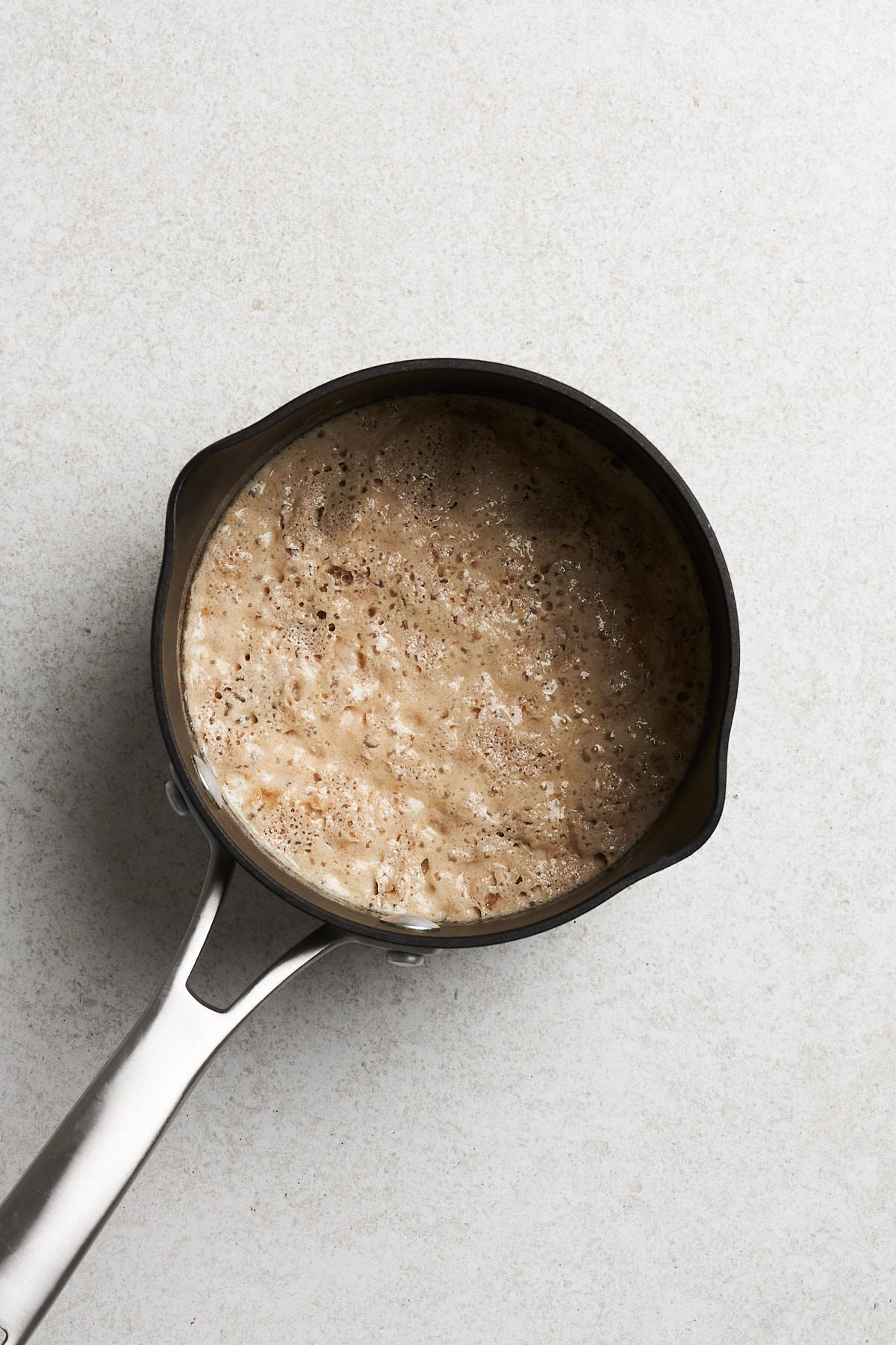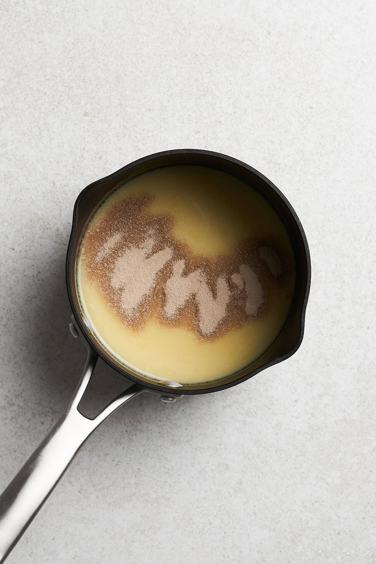 - Add the soy milk, vegan butter, and sugar to a small saucepan. Heat it until lukewarm (110ยฐF). Add the yeast, cover the pot, and let it bloom for 10-15 minutes.