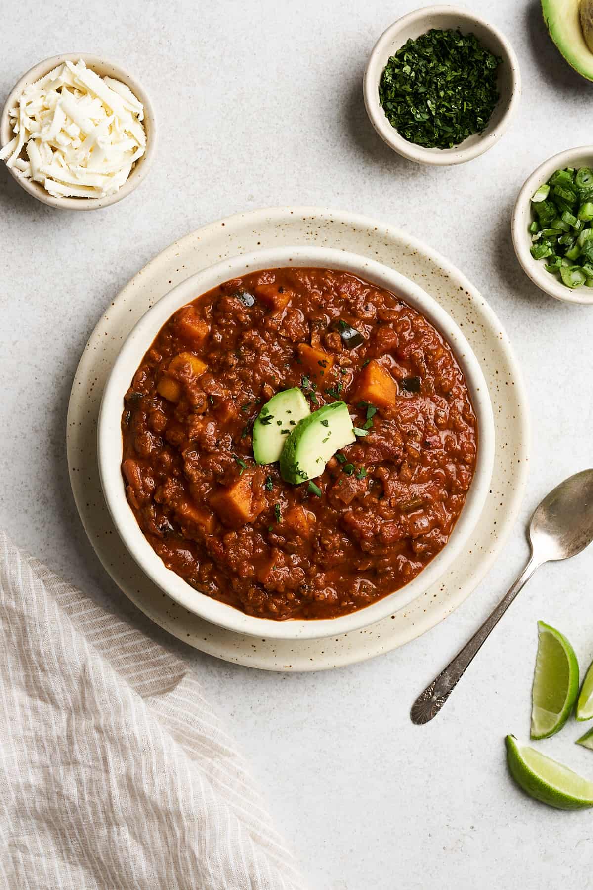 - Sweet potato: Perfectly complements the spiciness of the chili and adds a soft, creamy texture. Cubed butternut squash will also work.