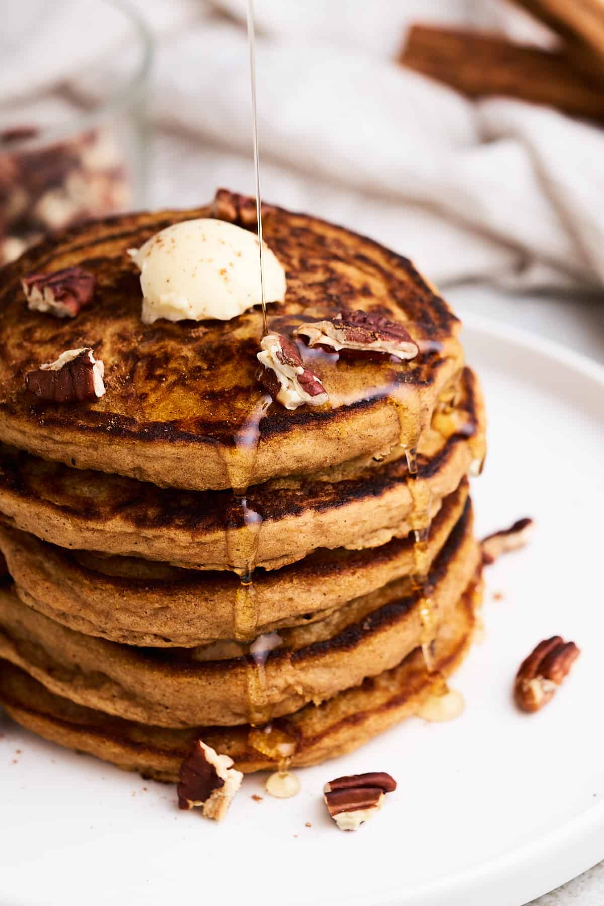 Serve your pancakes with a pat of butter, a drizzle of maple syrup, and some toasted pecans for a quintessential fall and winter breakfast or brunch.